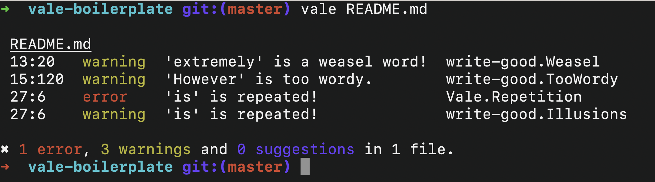 Congratulations! If you can see these lines, it means that you have successfully run your first check using Vale.