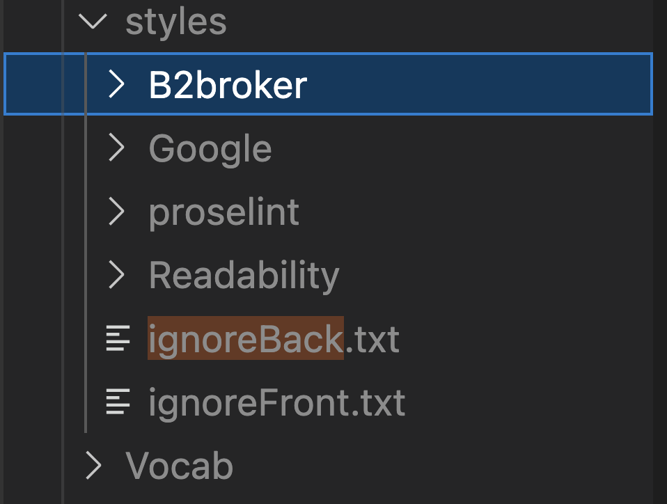 Create a file named .vale.ini in the folder where your text files are stored (the en folder in our projects) and paste the following code into it: